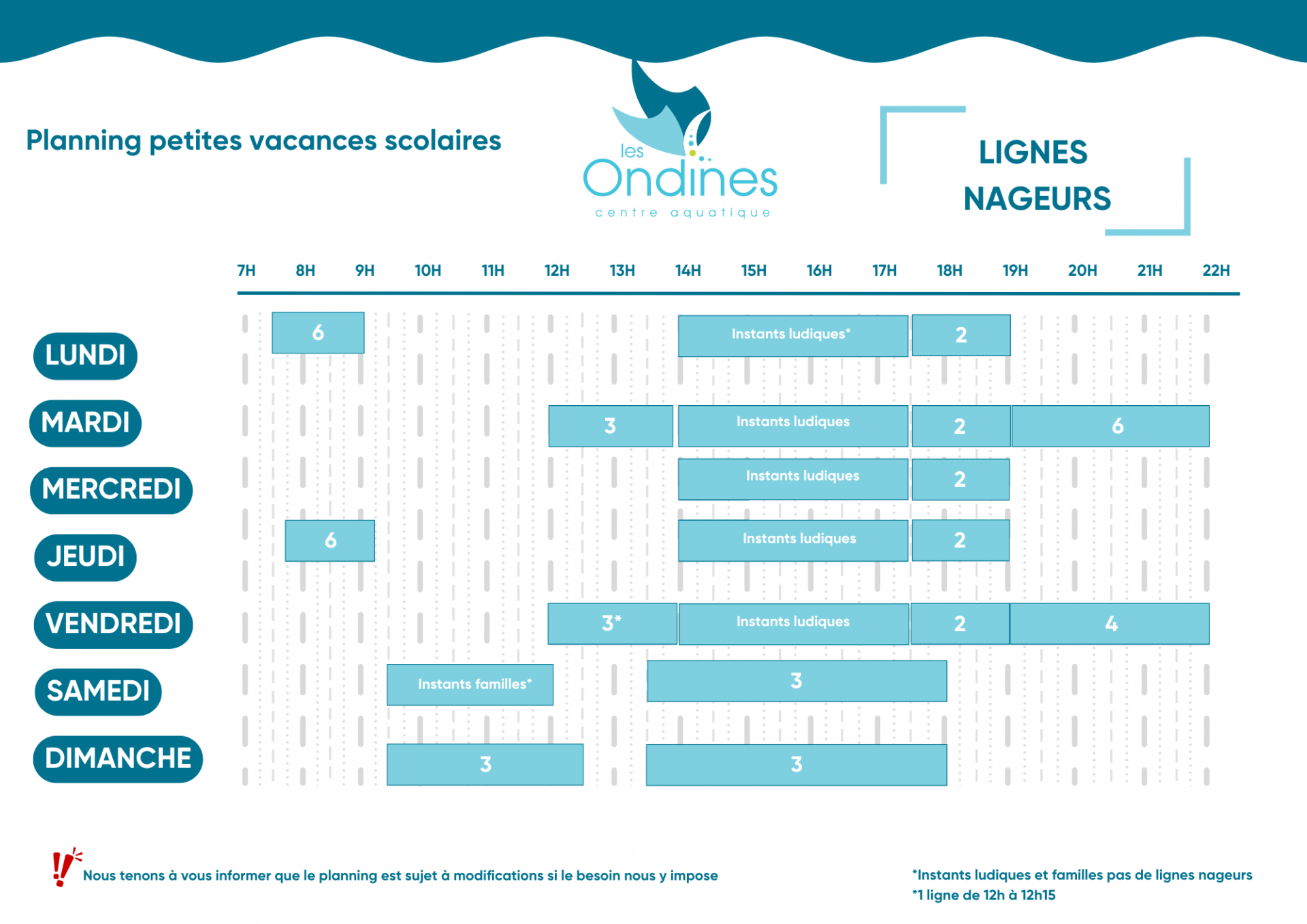 - Ludinage Bleu/Rouge : 11h00 - 11h45 (amélioration du dos et initiation au crawl)